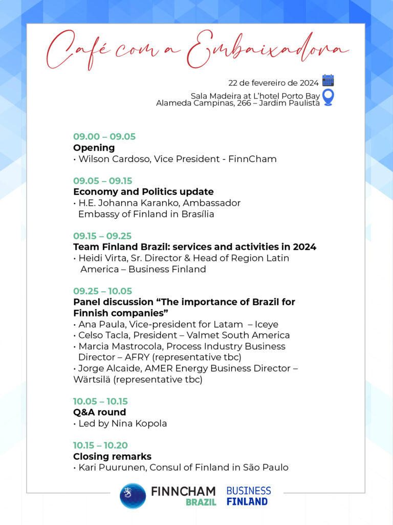 FinnCham Brazil wants to invite you to the Café com a Embaixadora, Thursday 22nd of February!